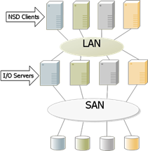 GPFS采用了水平結(jié)構(gòu)的設(shè)計(jì),支持SAN組織形式或NSD組織形式(或兩者的混合),在架構(gòu)上每一層都可以得到擴(kuò)展,避免了互相的牽連性以及性能的制約性。