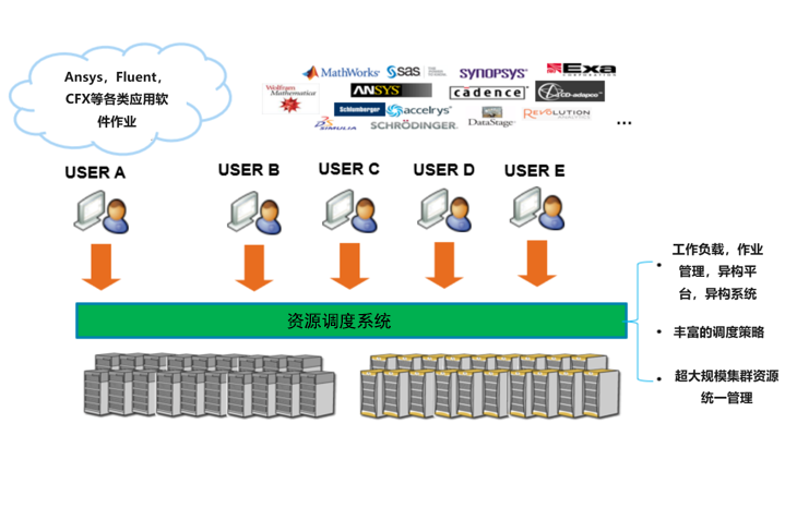 支持異構(gòu)的、多操作系統(tǒng),多集群擴(kuò)展,多集群負(fù)載調(diào)度,多集群許可證調(diào)度,多集群資源管理,作業(yè)管理,作業(yè)控制,作業(yè)資源使用限制,并行作業(yè)運(yùn)行資源使用統(tǒng)計(jì),各種并行作業(yè),海量作業(yè)提交和調(diào)度,并行作業(yè)控制,并行作業(yè)容錯(cuò),高級(jí)預(yù)約功能、回填、搶占,絕對(duì)優(yōu)先級(jí),獨(dú)占等多種調(diào)度策略,基于GPU的調(diào)度,具備多種MPI實(shí)現(xiàn)方式,包括MPICH,OPEN MPI,INTEL MPI,PE,PLATFORM MPI等。